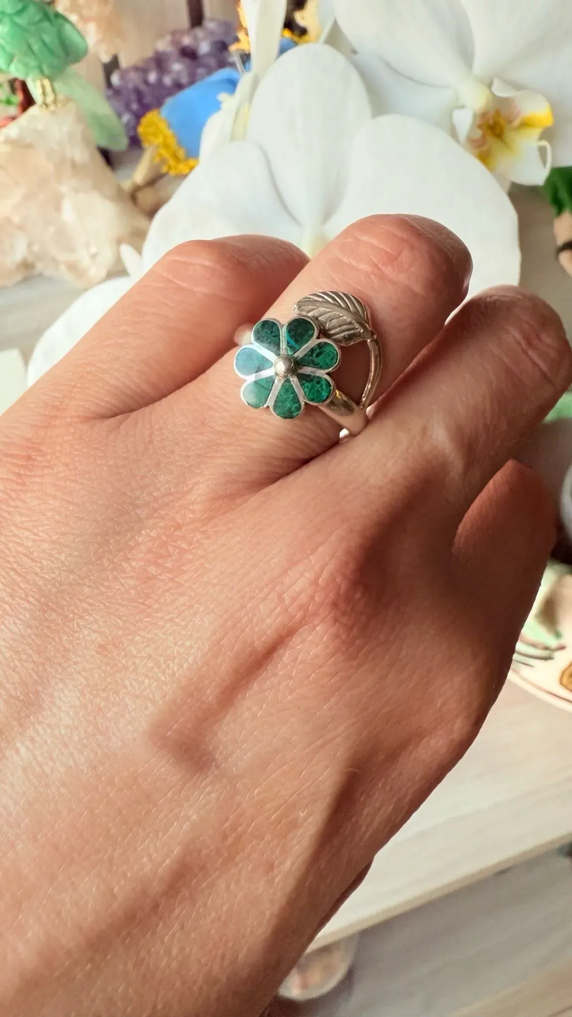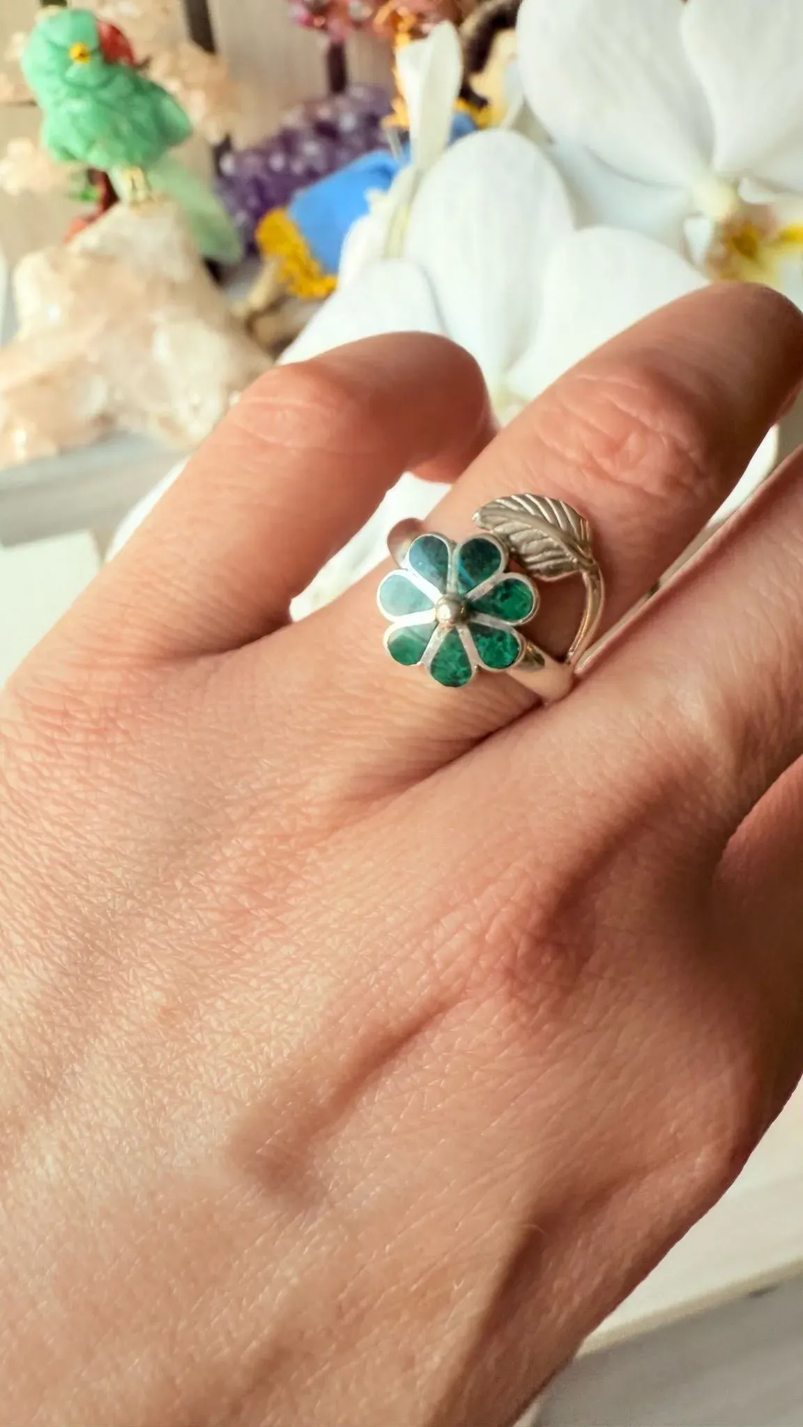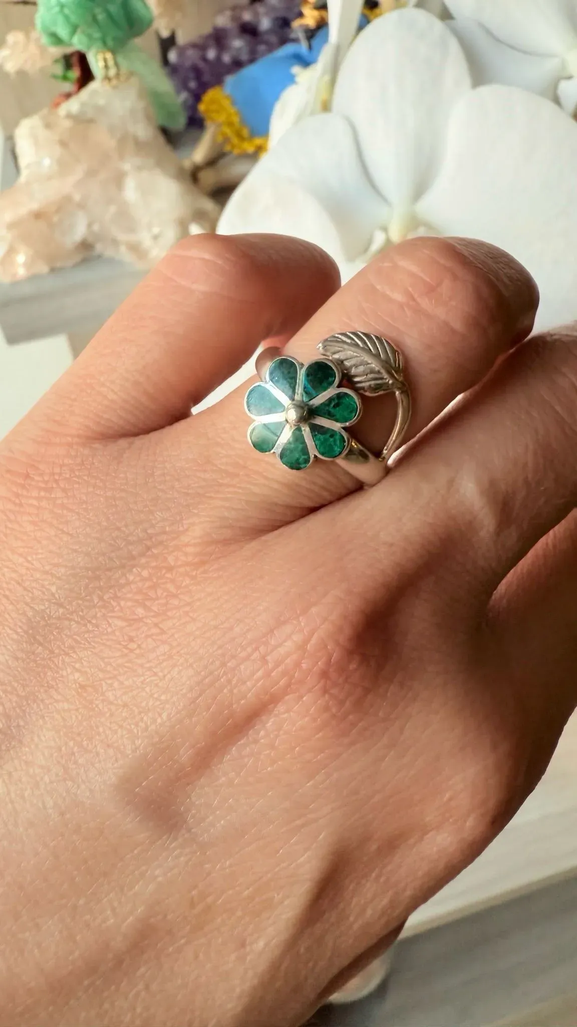 ✨ Anillo Rosa y Hoja – Plata 950 con Turquesa Peruana ✨Disponible en talla 8 💫