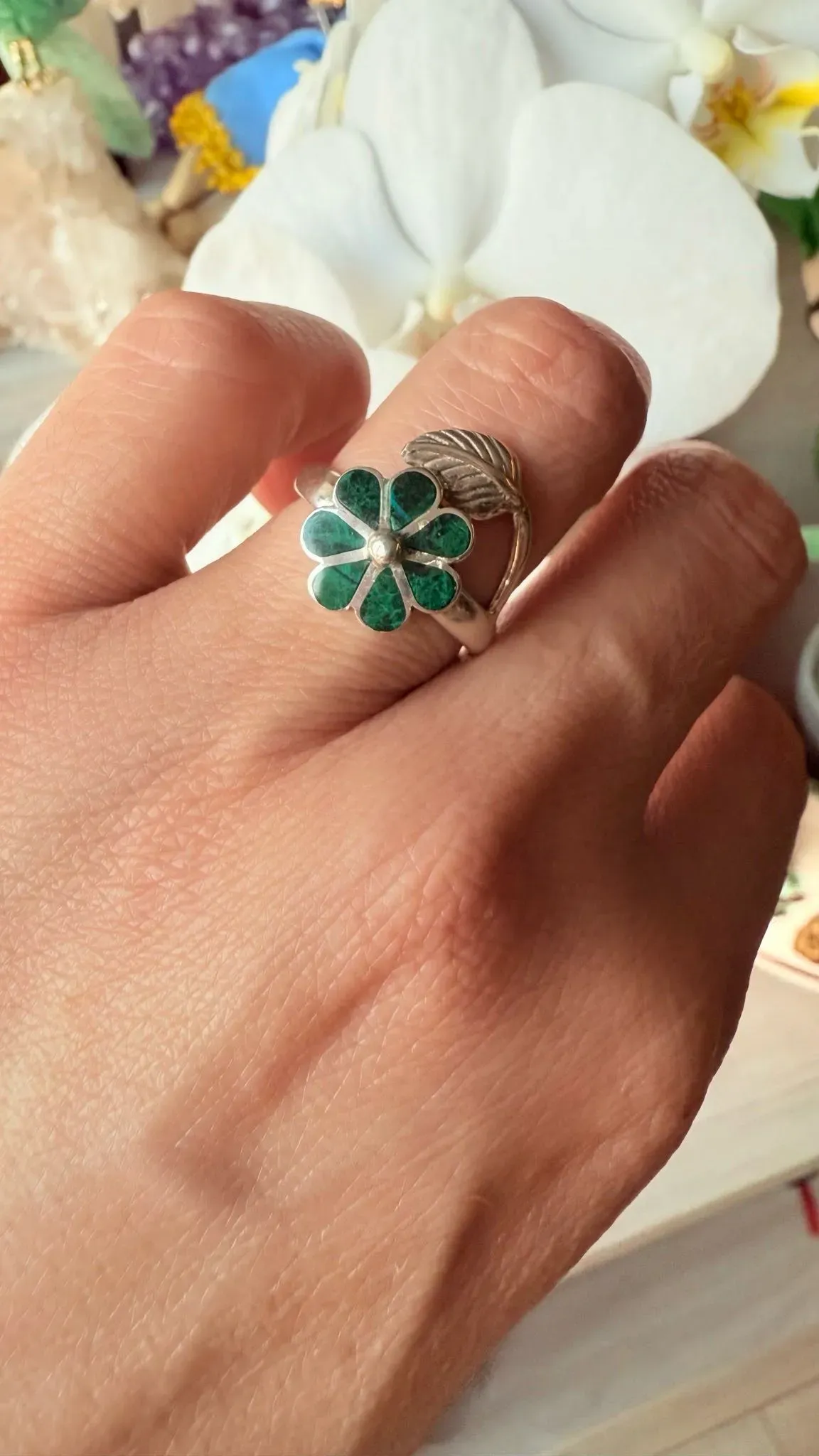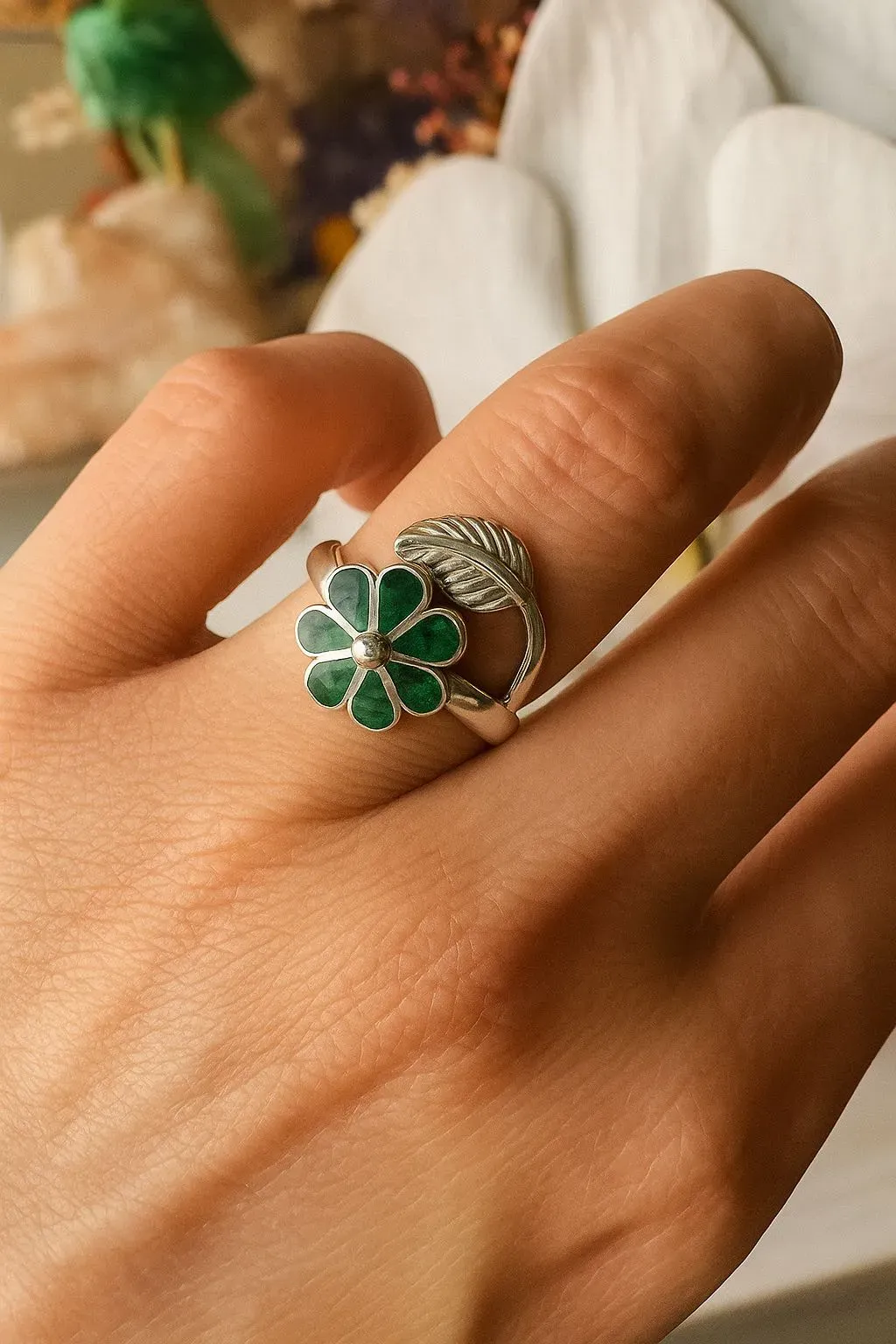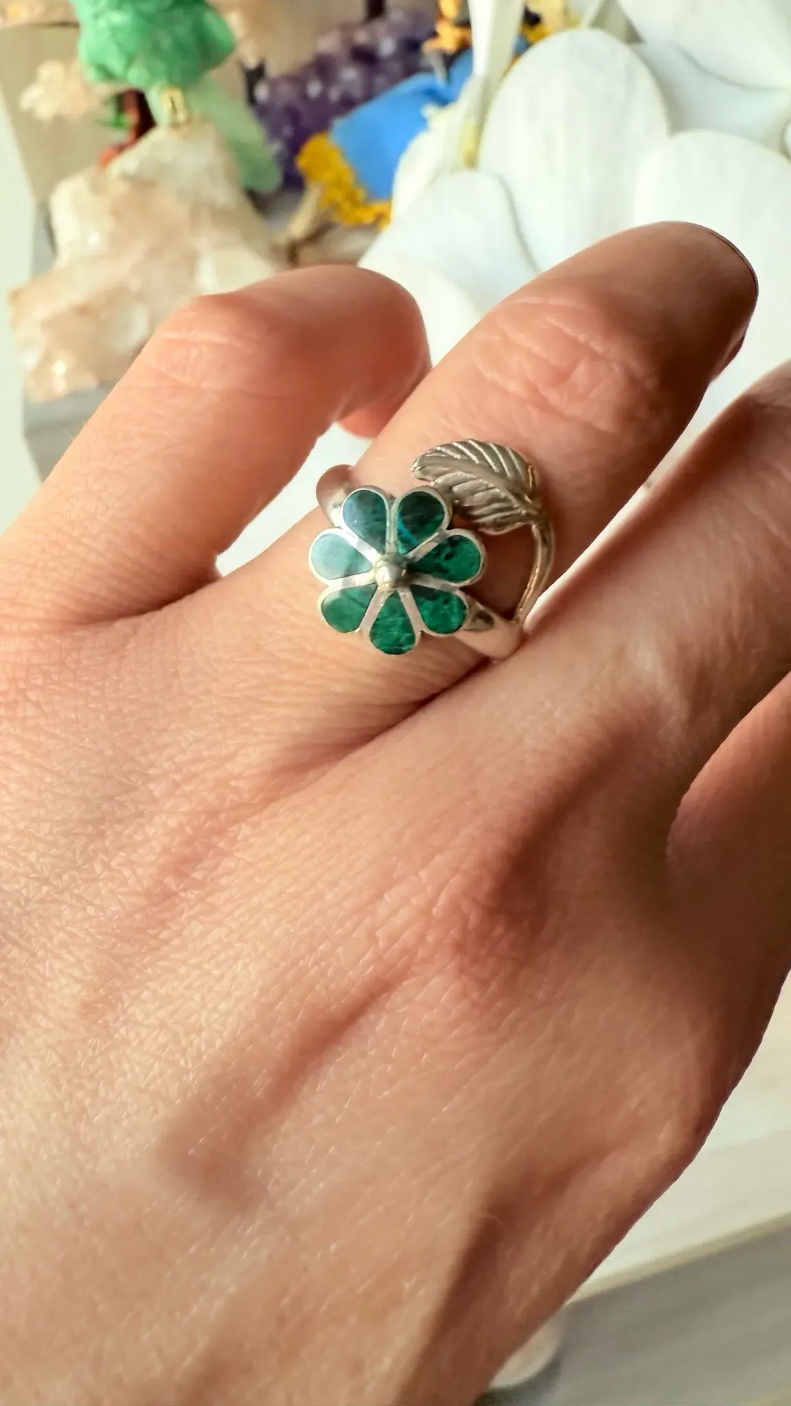 ✨ Anillo Rosa y Hoja – Plata 950 con Turquesa Peruana ✨Disponible en talla 8 💫