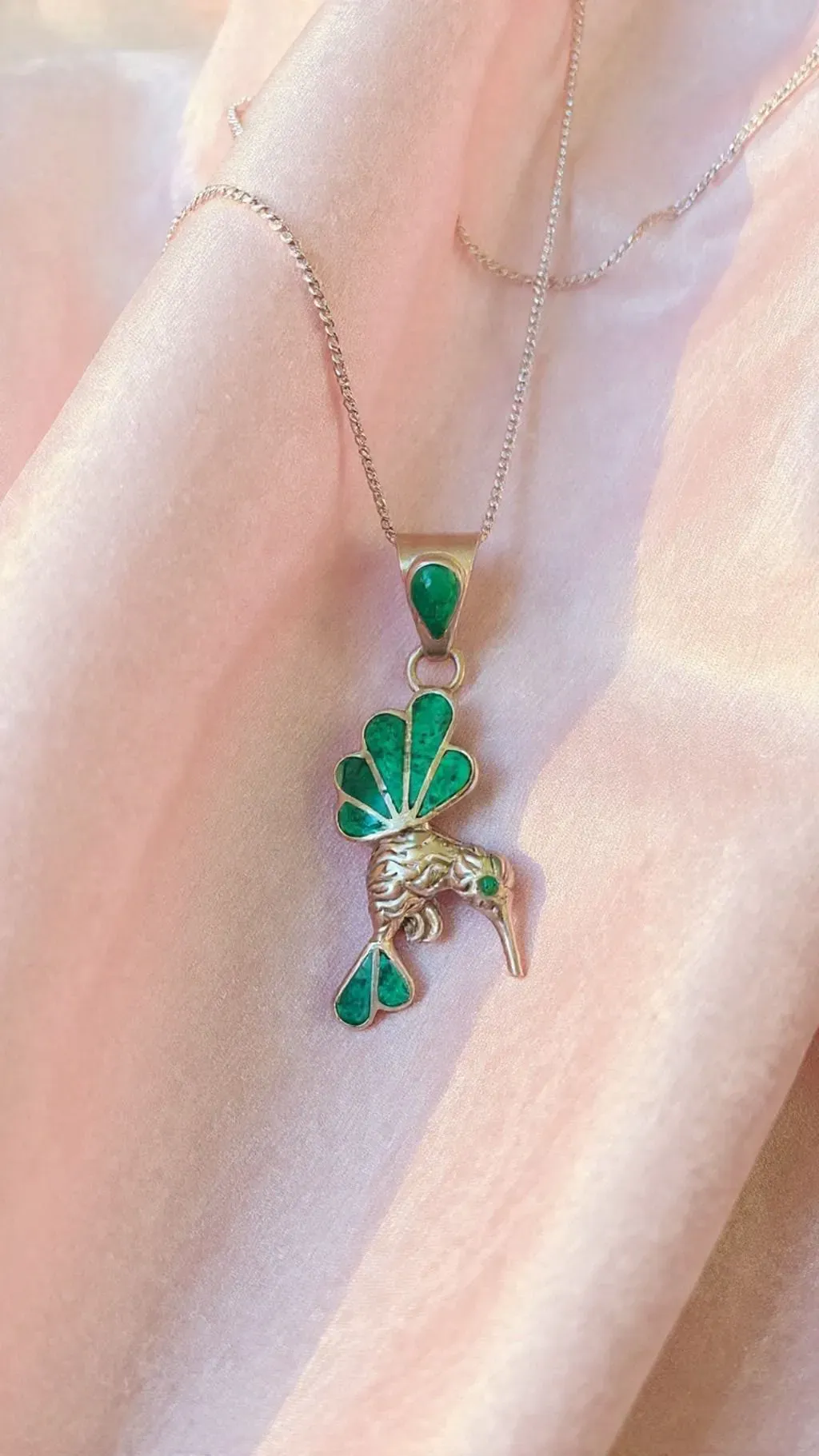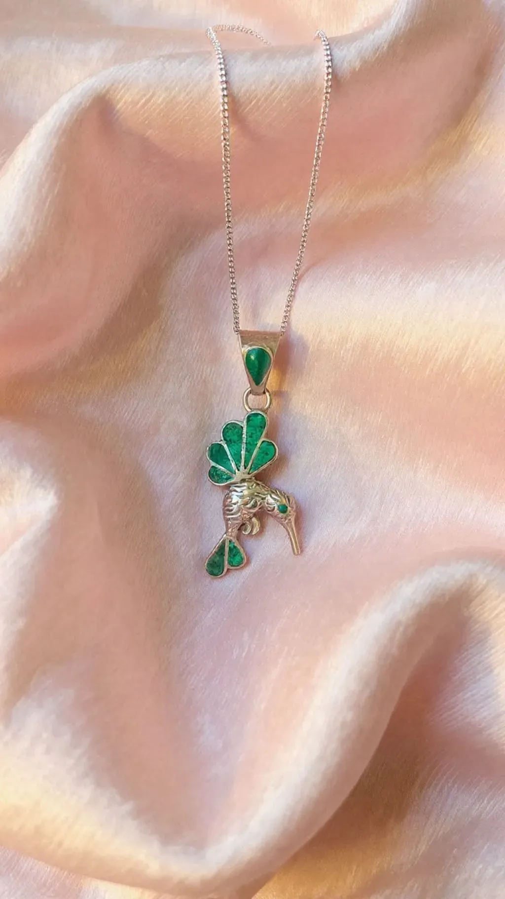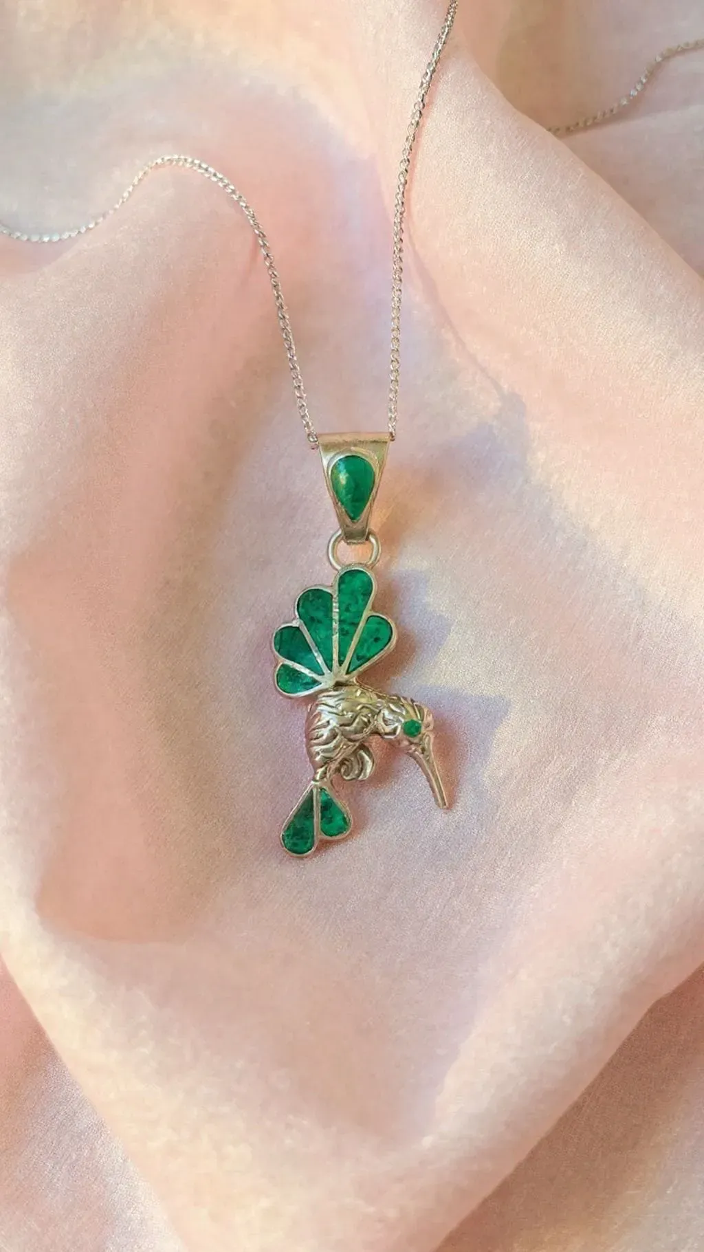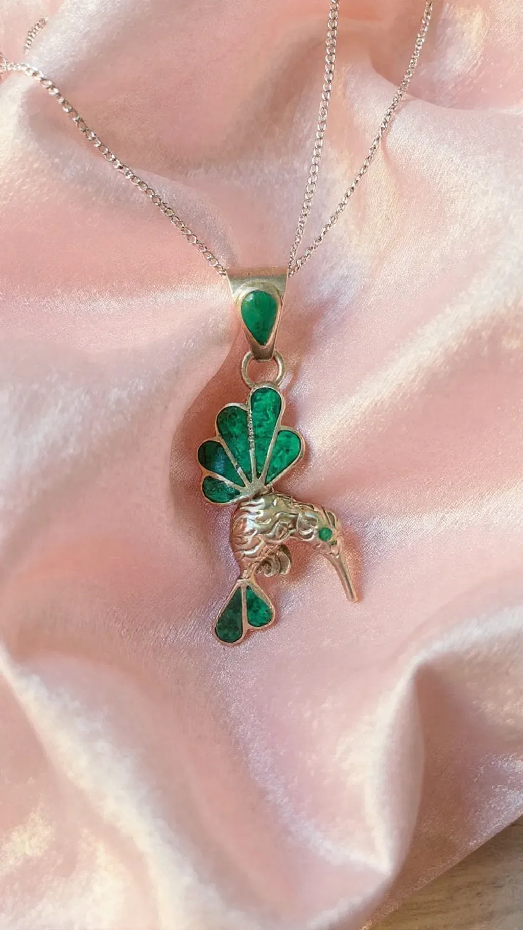 Diseño delicado y artesanal inspirado en la ligereza y belleza del colibrí, elaborado a mano con dije en plata 950 y cadena en plata 925, adornado con turquesa peruana natural 🌿