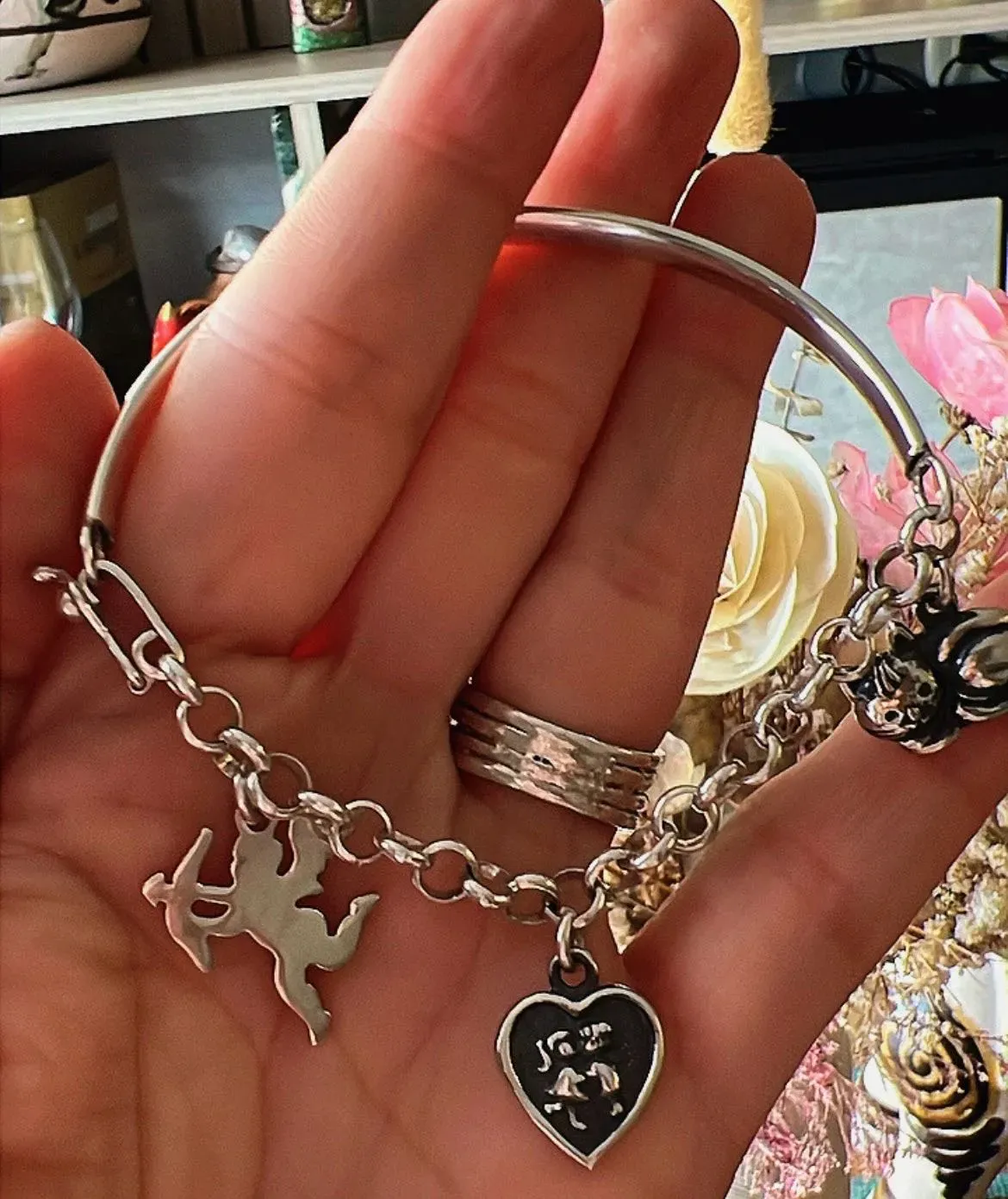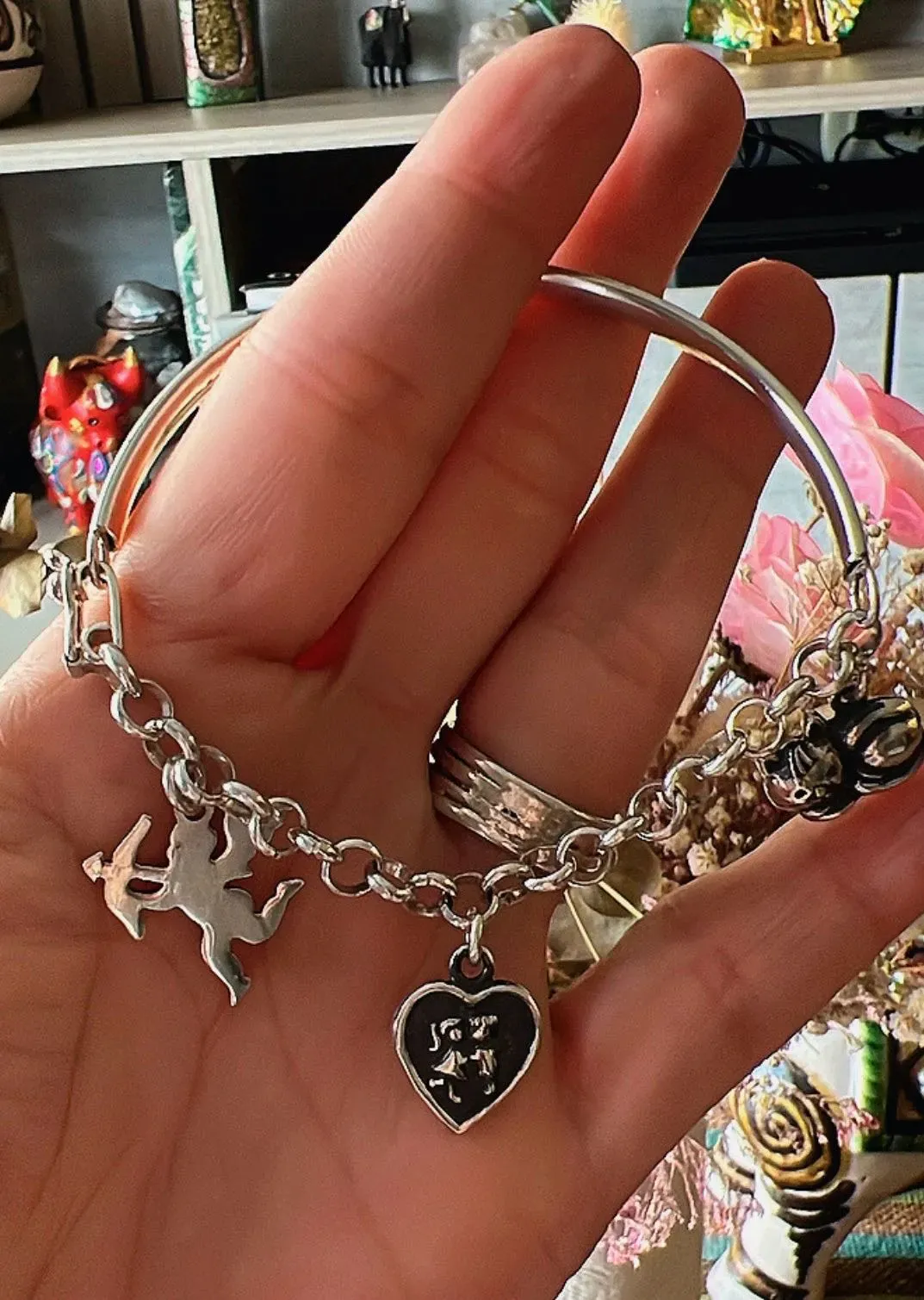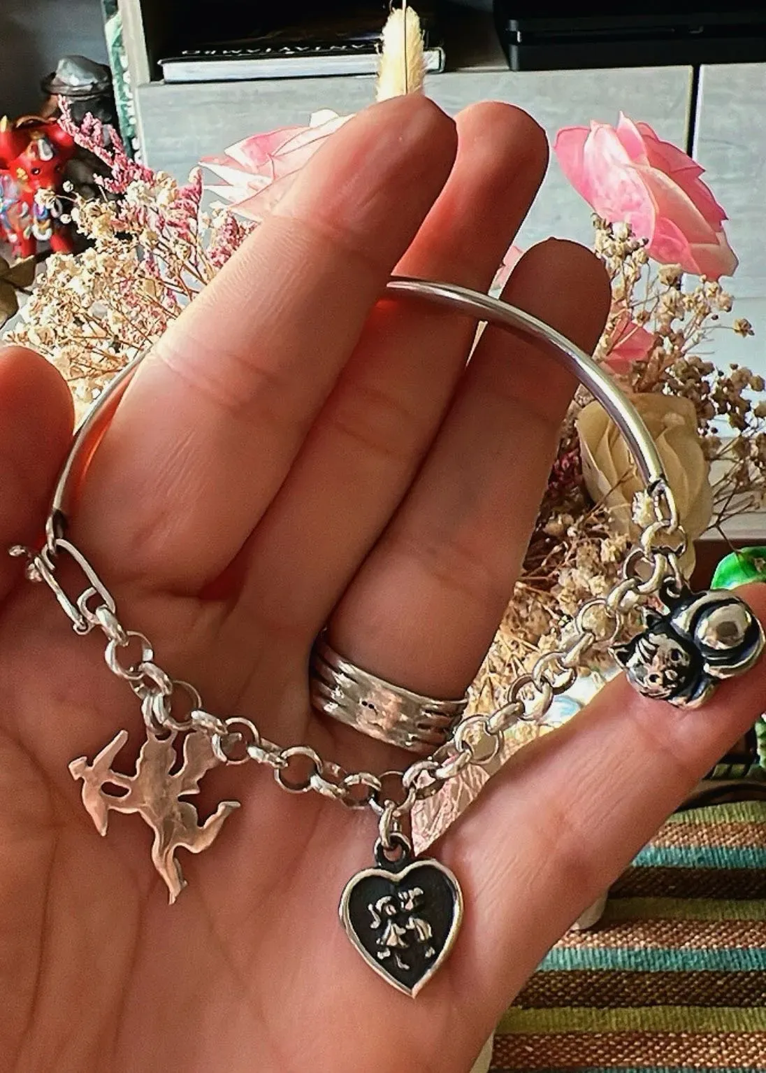 Diseño artesanal y sofisticado, elaborado a mano en plata quemada 950, con tres dijes cuidadosamente trabajados que aportan estilo, textura única y un toque de elegancia 💫