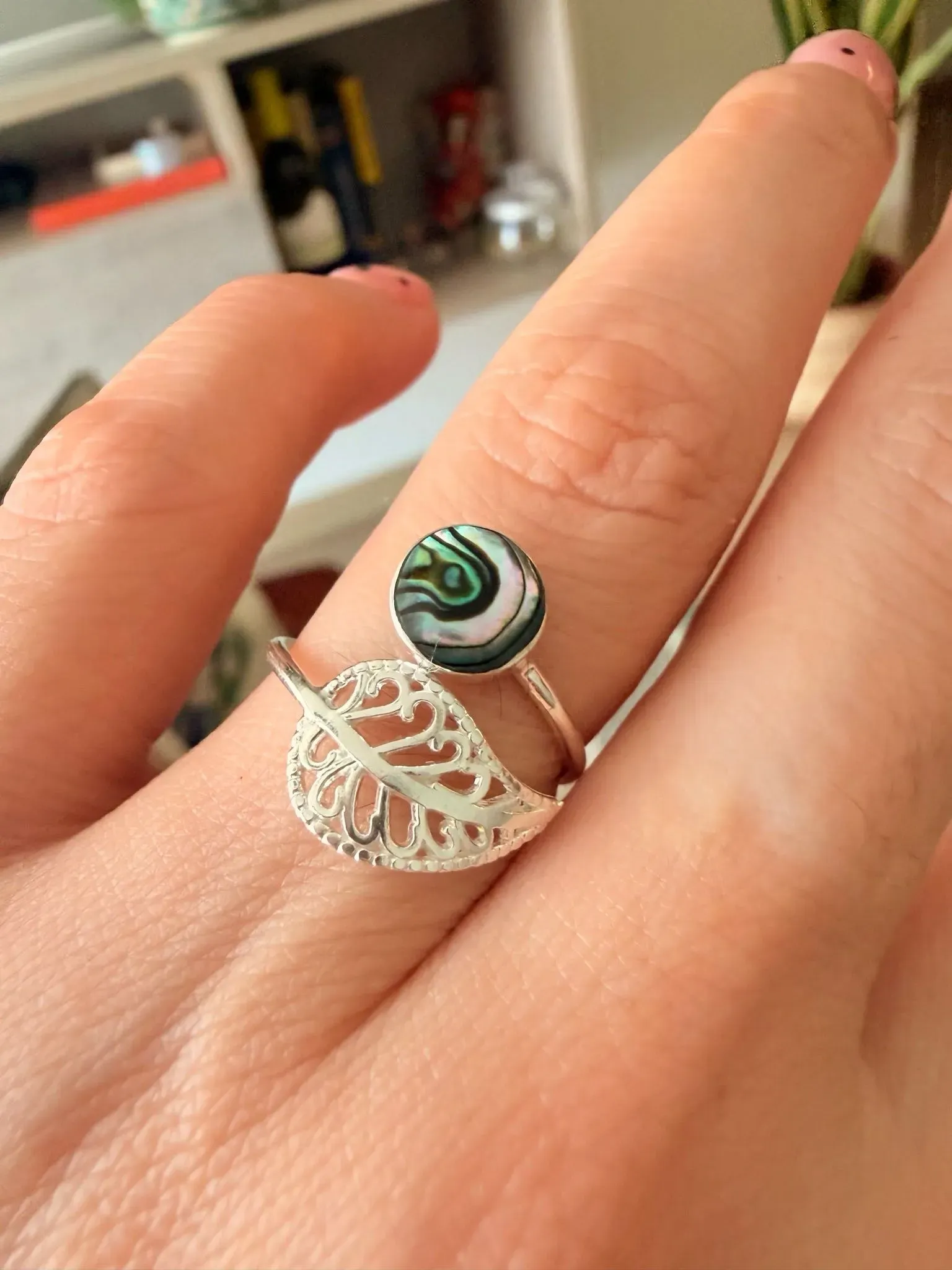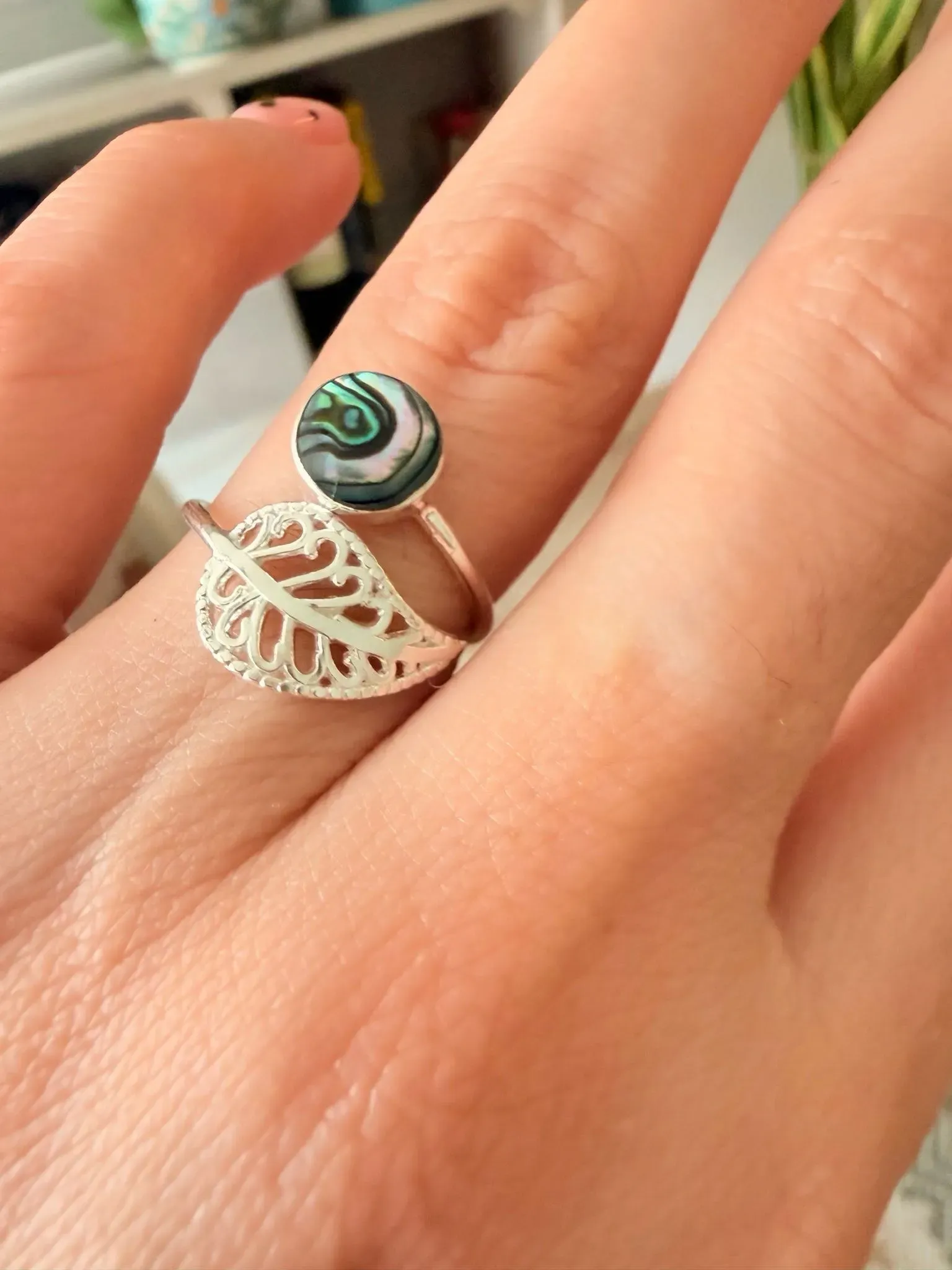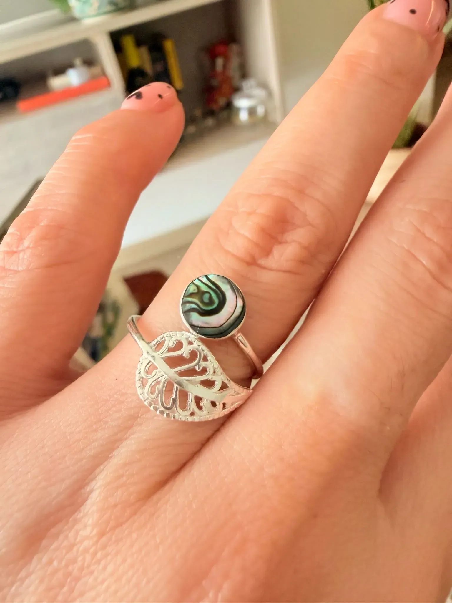 ✨ Anillo hoja concha marina avalon – Plata 950 ✨Delicado diseño inspirado en la naturaleza, con concha marina avalon que aporta destellos iridiscentes sobre la pureza de la plata 950. 🌿✨Disponible en talla ajustable. 💍