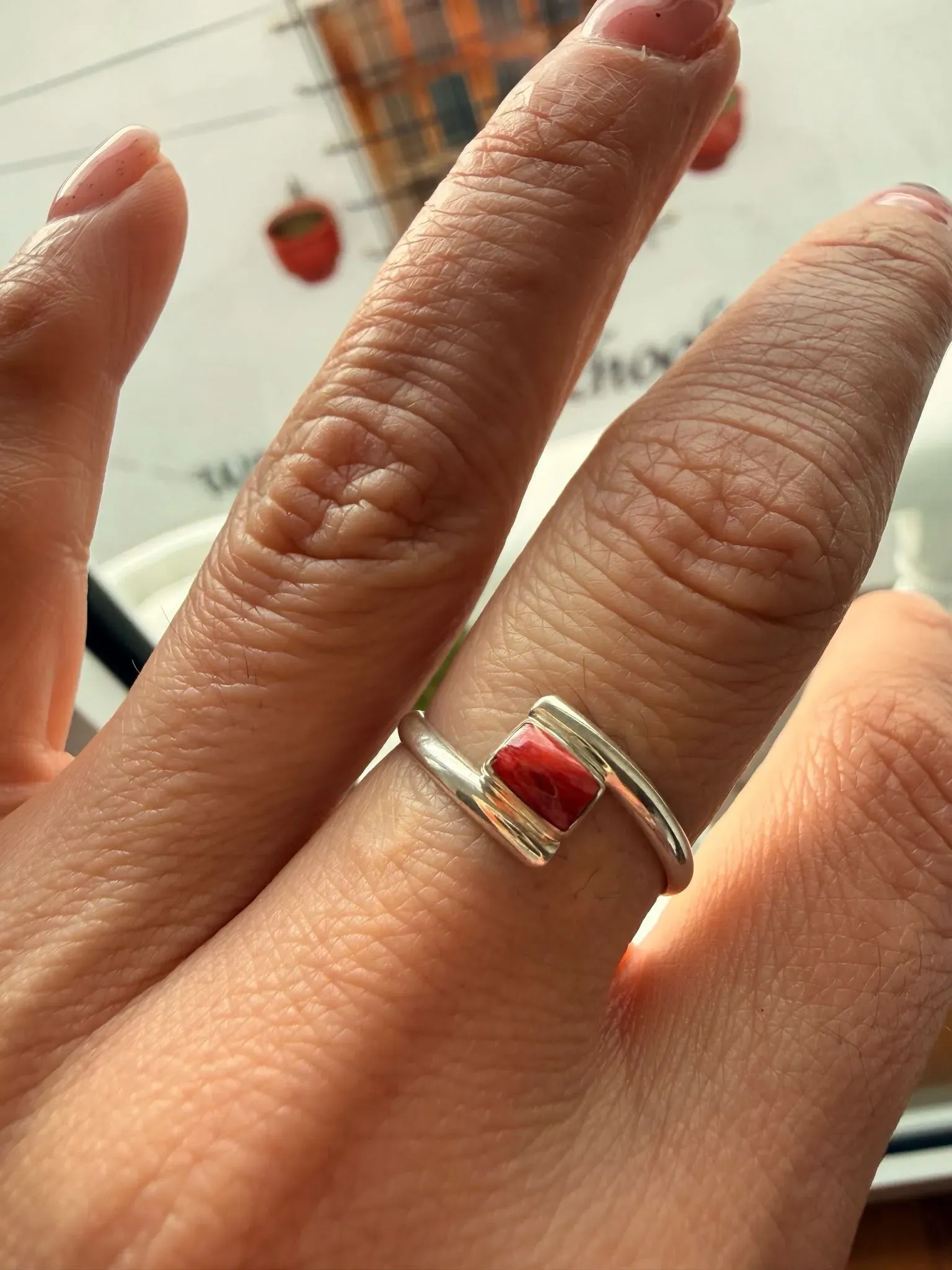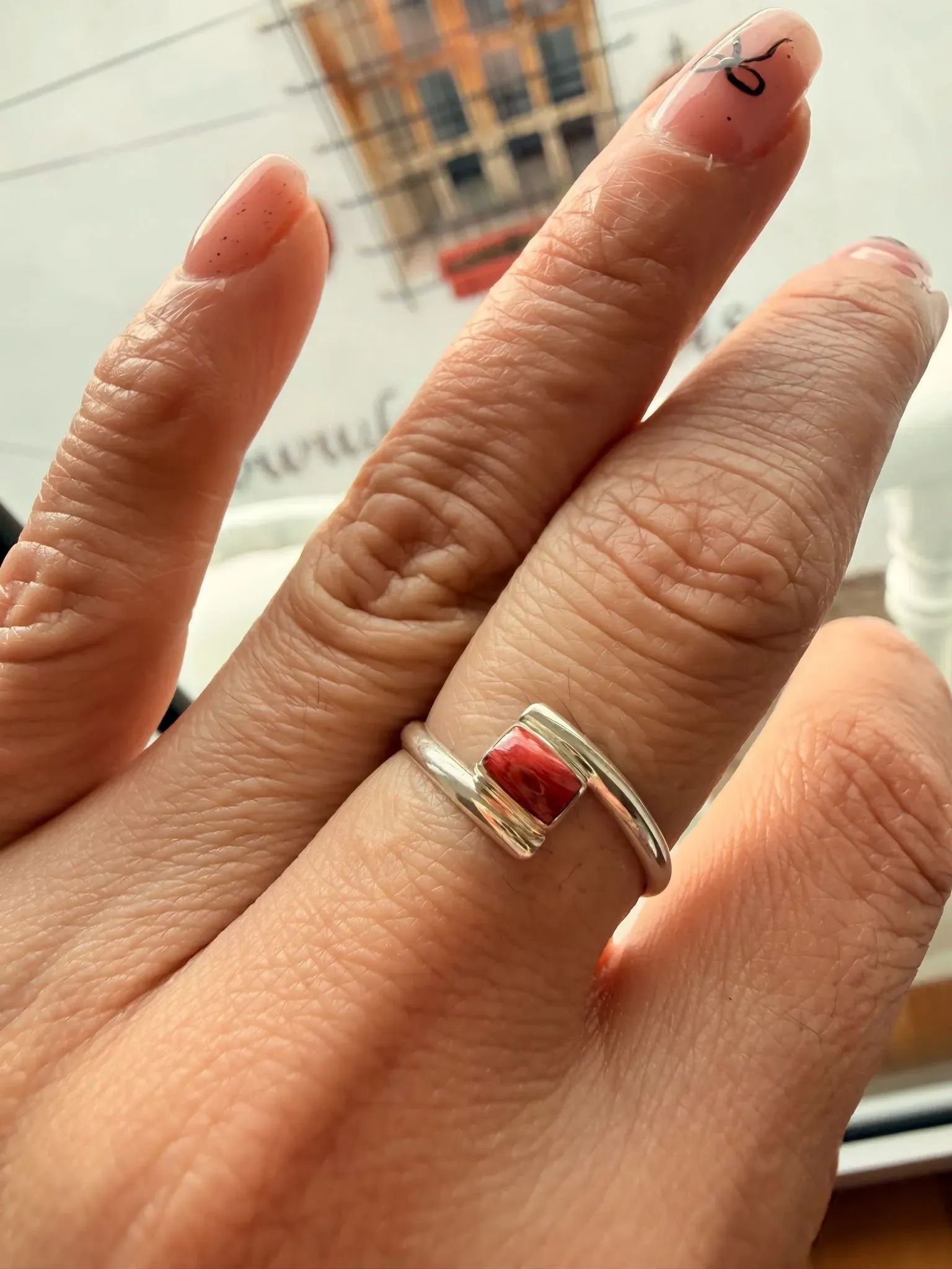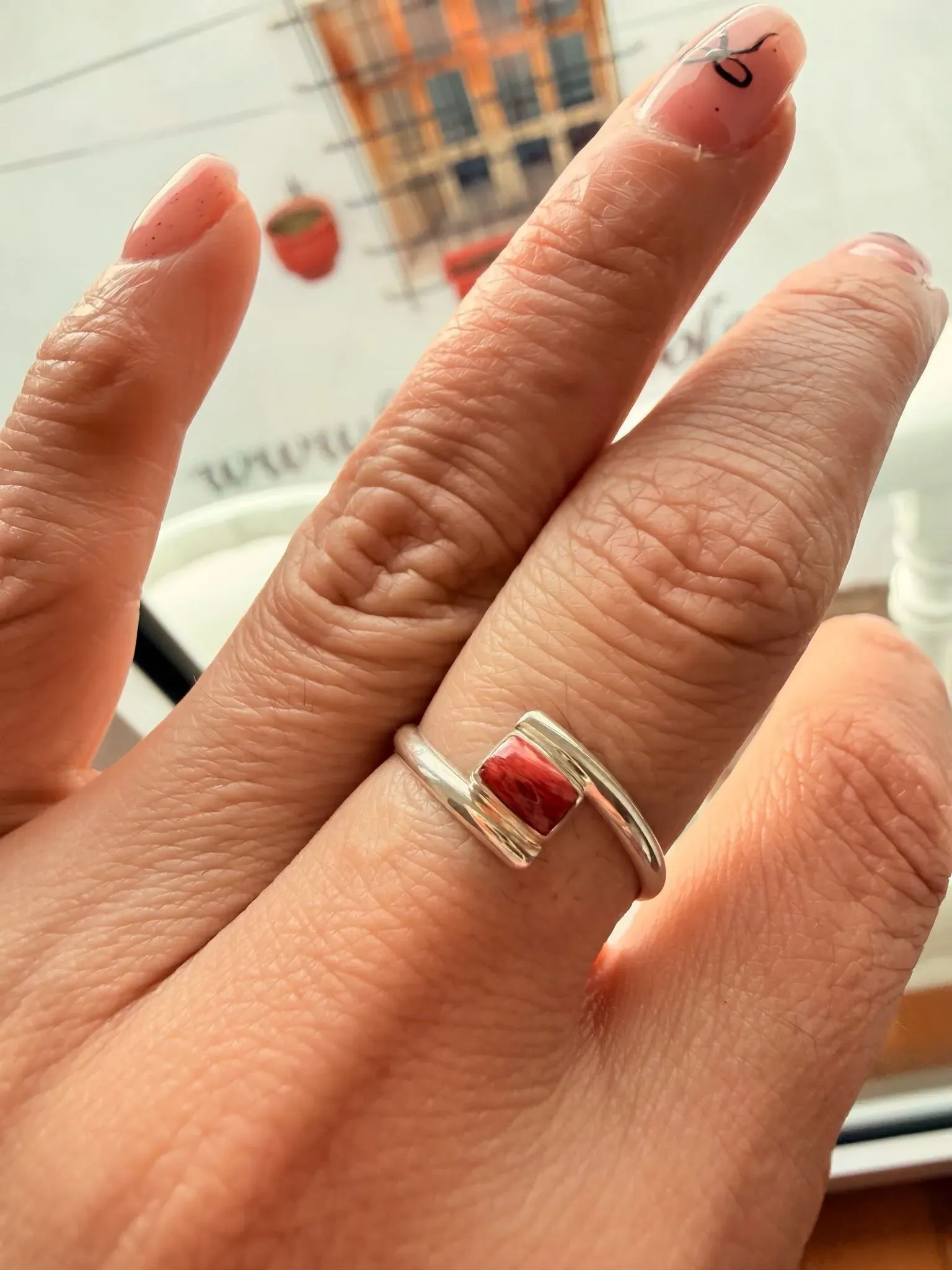 Anillo cruzado elaborado en plata 950, con delicada concha marina Spondylus naranja.🌊 Talla 8