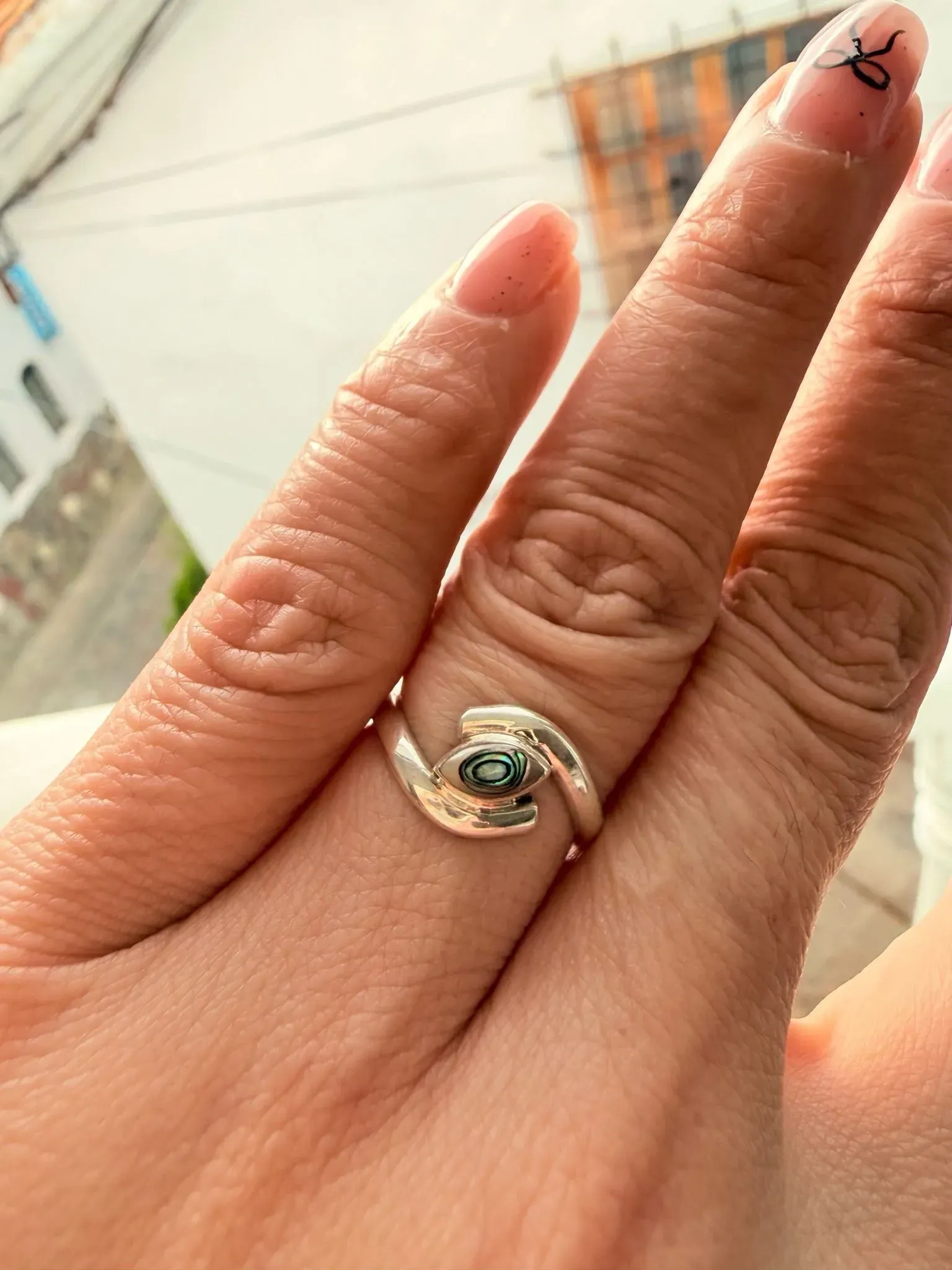 Anillo cruzado elaborado en plata 950, con delicado detalle de concha marina abalone de reflejos naturales y tonos nacarados.✨ Talla 6