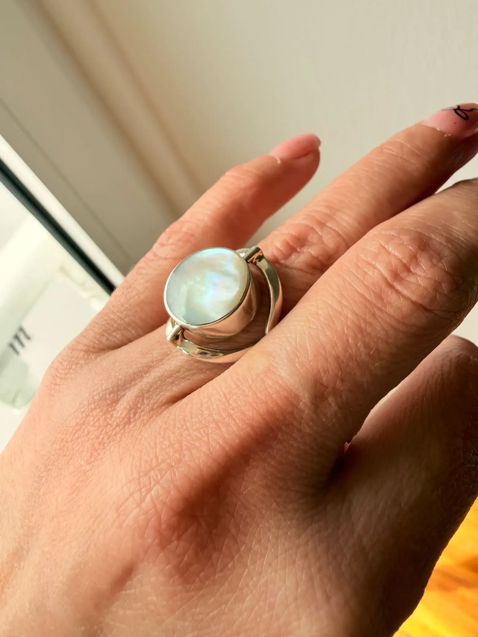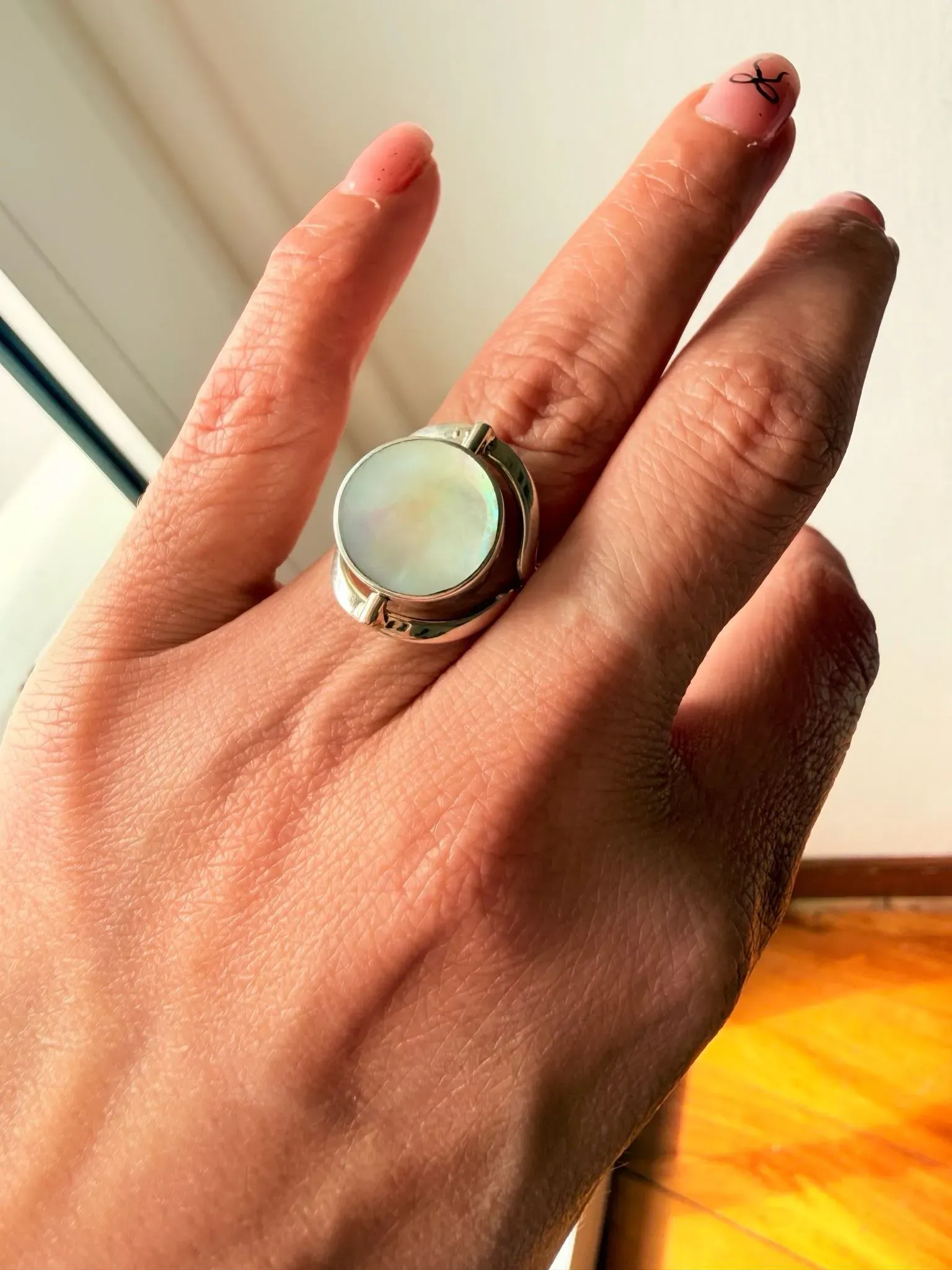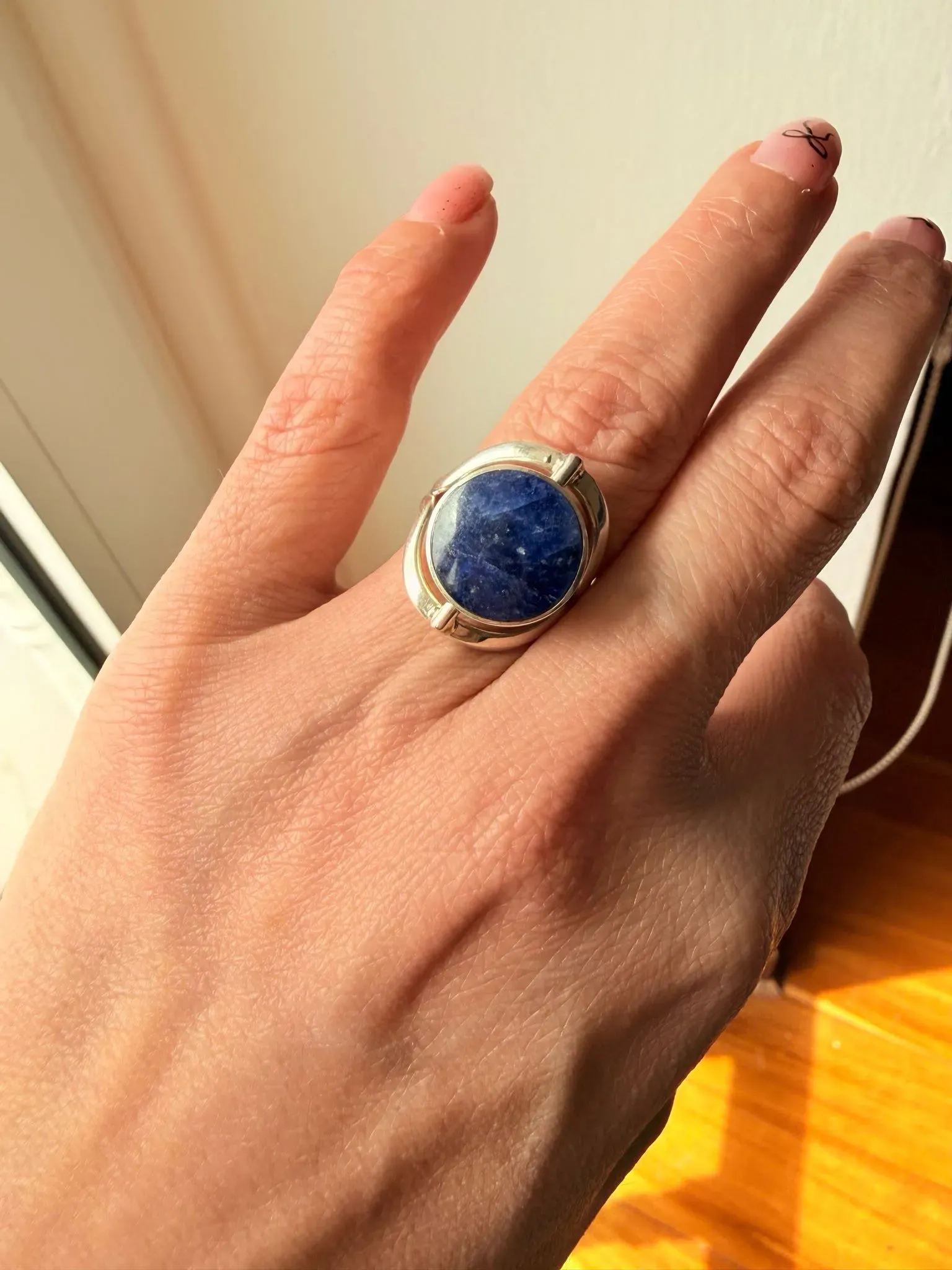 Anillo reversible elaborado en plata 950, con un diseño versátil que combina piedra natural lapislázuli y madreperla.💫 Talla 7
